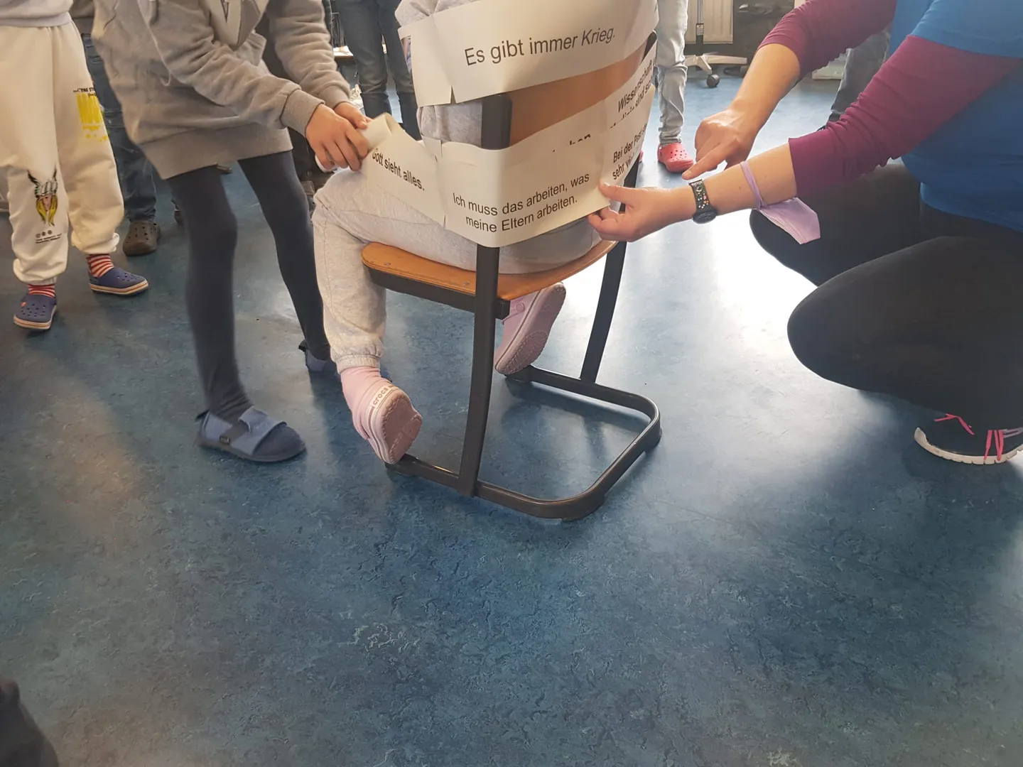 Um zu erklären, warum die Menschen sich dann zu so einer Befreiungsbewegung zusammen geschlossen haben, wurde eine Schülerin in eine Papierrolle gewickelt, die mit ganz vielen Begriffen aus der Lebenswelt im Mittelalter beschrieben war. Um sich daraus zu befreien, musste sie Kraft einsetzten und Entschlossenheit und das Papier zerreißen.