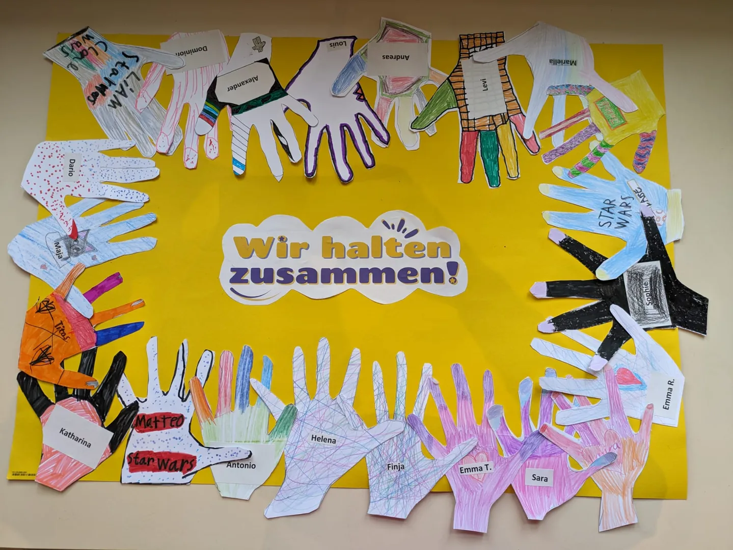 Am Tag 1 wanderten die Schüler*innen in Kleingruppen durch 4 Stationen. Es entstanden unter anderem ‚Rätselblumen‘ mit Eigenschaften, Lieblingsdingen und Hobbys der Kinder. Zum Tagesabschluss rätselte dann die Klasse: wer von uns ist das? Den Tag 2 verbrachten wir dann mit lauter Teamspielen im Gemeindesaal. Am Ende entstand ein gemeinsames Bild mit dem Titel ‚Wir halten zusammen!‘.