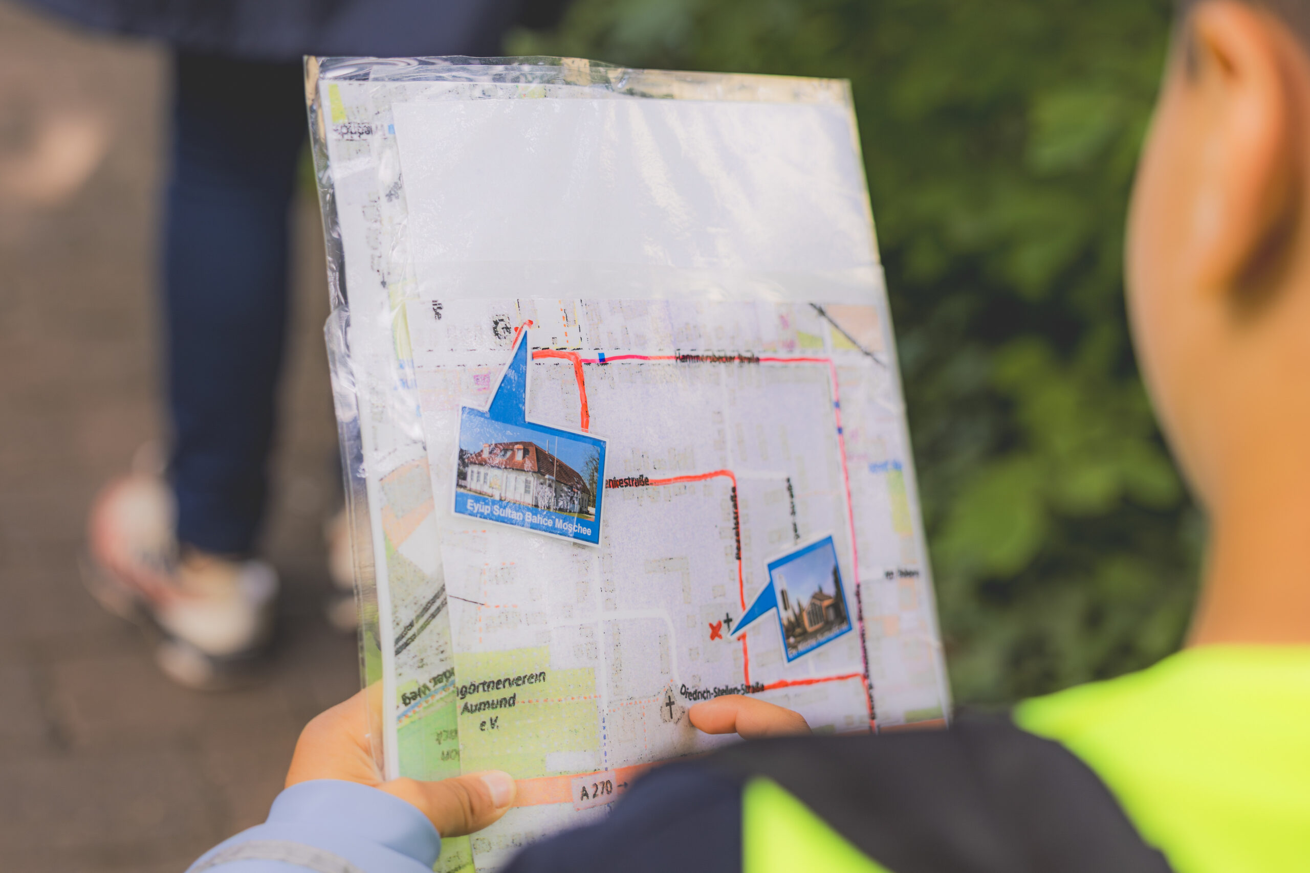 Drei Klassen der Grundschule Alt-Aumund haben sich auf gemacht, zur interreligiösen Stadtteilerkundung. Gleich morgens um 8:30 Uhr ging es los zu unserem ersten Ziel, dem Gemeindehaus in der Pezelstraße, der Kirchengemeinde Aumund-Vegesack. Die Diakonin Natalie Lorke und die Gemeindepädagogin Josy Bell hielten spannende Spiele für die Schüler*innen der 3. Jahrgangsstufe bereit, um die Kirche kennenzulernen. Nach einer stärkenden Frühstückspause ging es dann nur wenige Minuten zu Fuß, mit Glockengeläut im Rücken weiter. Als Nächstes waren wir zu Gast in der Eyüp Sultan Bahce Moschee an der Hammersbeckerstraße. Der Imam der Gemeinde und ein ehrenamtlicher Gemeindevorsteher hießen uns sehr herzlich willkommen, zeigten uns die Räumlichkeiten und beantworteten alle Fragen der Schüler*innen. Nachdem wir den Gebetsruf hören durften und eine kleine Stärkung zu uns genommen hatten, ging es eine halbe Stunde zu Fuß bis zu unserem dritten Ziel, dem Denkort der Synagoge in Aumund, an der Ecke ‚An der Aumunder Kirche‘/ ‚Neue Straße‘. Hier konnten die Schulklassen durch Pastor Jan Lammert etwas über die Synagoge, das Judentum und die Zerstörung der Synagoge zu Zeiten des Nationalsozialismus erfahren. Mit vielen Eindrücken und schon sichtlich müden Füßen machten sich die Schüler*innen auf den letzten Abschnitt ihrer Stadtteilerkundung, zum Gustav-Heinemann-Bürgerhaus in Vegesack. Hier wurden die Lunchpakete geleert und es gab Zeit zum Spielen und erholen, in den Räumen des Zirkustheaters Tohuwabohu. Drei tolle Tage voller Wege, Religionen, Geschichten, Räume für Kinder und Wetterlagen liegen hinter uns. Schön war es mit euch unterwegs zu sein, gerne wieder!