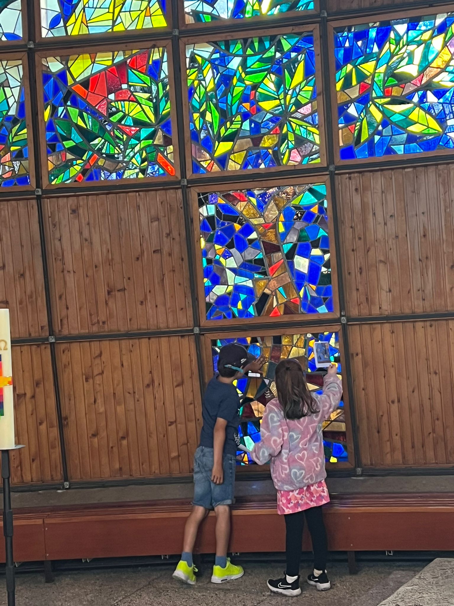 - An einer anderen konnten die Schüler*innen Mosaikfenster, die in der Kirche waren, puzzeln oder eigene Mosaikmuster legen.